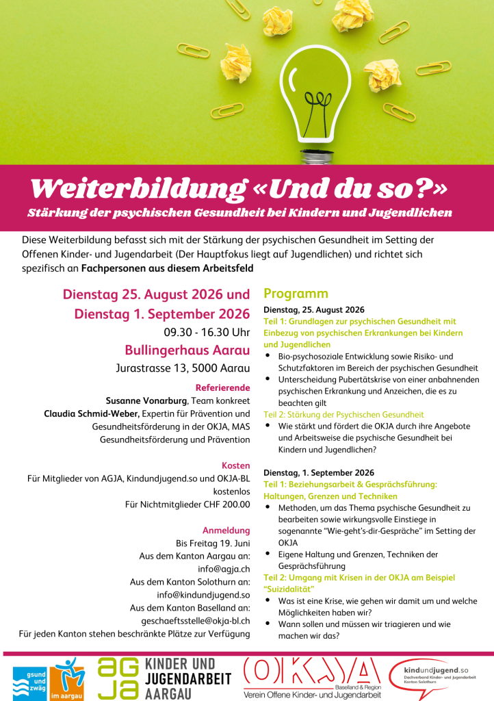 Diese Weiterbildung befasst sich mit der Stärkung der psychischen Gesundheit im Setting der Offenen Kinder- und Jugendarbeit.